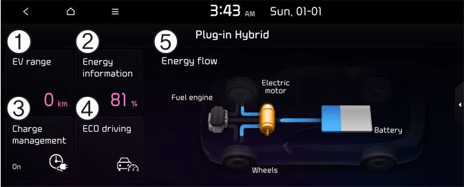 Менюто на хибридния автомобил с възможност за включване в електрическата мрежа се състои от пет раздела: [EV пробег], [Енергийна информация], [Управление на зареждането], [ECO шофиране], [Енергиен поток].