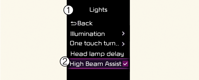 Когато автомобилът в положение ВКЛЮЧЕНО, изберете Lights (Светлини) → High Beam Assist (Асистент за превключване на дългите светлини) от менюто Settings (Настройки), за да включите функцията за Асистент за превключване на дългите светлини.
