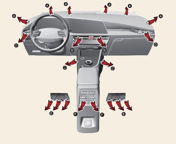 Към пода (A, C, D, E, F, H)По-голямата част от въздушния поток е насочена към пода, а малка част е насочена към предното стъкло, страничните устройства против замръзване на стъклата и страничните отвори за въздух.