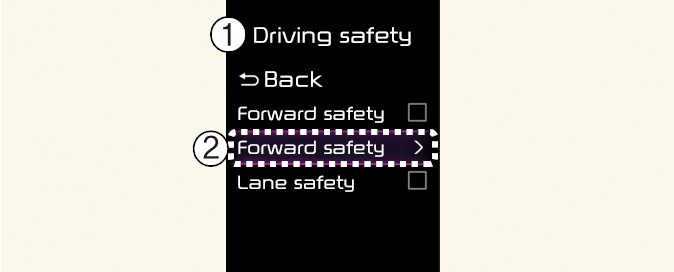 Forward Safety (Безопасност по отношение на трафика отпред): В зависимост от нивото на риска от сблъсък, ще прозвучи звуково предупреждение, волана ще вибрира (ако е оборудвана тази функция) и спирането ще бъде подпомогнато. Ако следното меню е деактивирано, асистентът за избягване на челен сблъсък ще се изключи и предупредителната светлина (