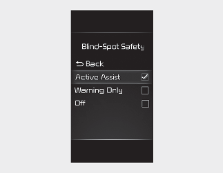 Когато бутонът за стартиране/спиране на двигателя е в позиция ON (Включено), изберете или изключете „Driver Assistance → Blind-Spot Safety“ (Помощ за водача → Безопасност по отношение на мъртвата зона) от менюто „Settings“ (Настройки), за да зададете дали да се използва всяка от функциите или не.