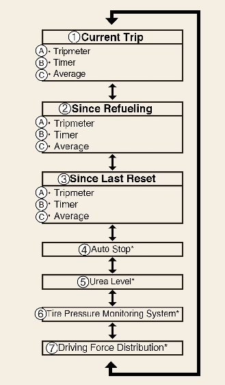 This display shows the trip distance, the average fuel efficiency, and the total driving time information once per one ignition cycle.
