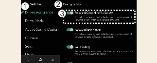 Forward/Side Safety: Collision warning or emergency steering will assist the driver in a collision-imminent situation. If you deselect the setting, Forward safety will turn off and the Emergency steering warning light (