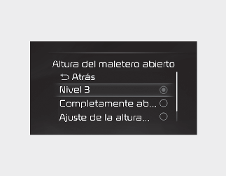 Para ajustar la altura de apertura del portón trasero eléctrico, vaya a "User Settings (Ajustes Usuario) → Door (Puerta) → Power Tailgate Opening Height (Altura de apertura del portón trasero eléctrico) → Level 1/Level 2/Level 3/Full Open/User Height Setting (Nivel 1/Nivel 2/Nivel 3/Completamente abierto/Configuración de la altura por el usuario)" para ajustar la altura del portón trasero del vehículo.