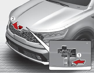 Vaya a la parte delantera del vehículo, eleve el capó ligeramente, empuje el enganche secundario (1) hacia la izquierda y