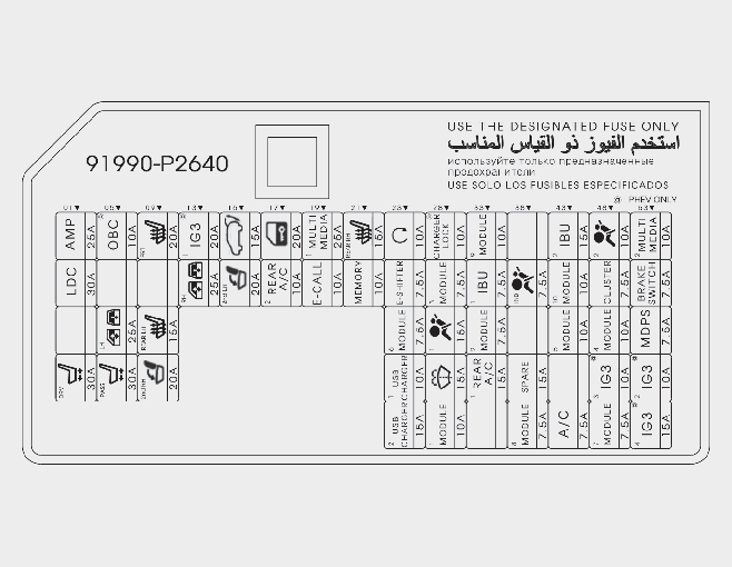 Bloque de empalmes ICU (fusible - AMP, LDC, CALEFACCIÓN DE LOS ASIENTOS DELANTEROS, ELEVALUNAS ELÉCTRICO DERECHO, PLEGADO DE LOS ASIENTOS TRASEROS IZQUIERDOS) |