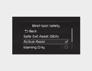 With the engine on, select or deselect 'Driver Assistance → Blind-Spot Safety' from the Settings menu to set whether or not to use each function.