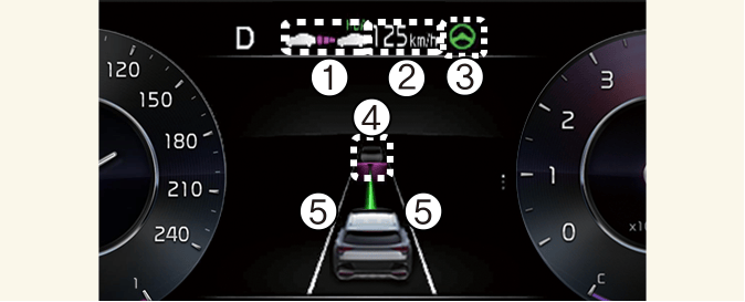 Es posible ver el estado de funcionamiento de la asistencia de conducción en autopista en la vista de asistencia al conductor del tablero. Consulte Más detalles.