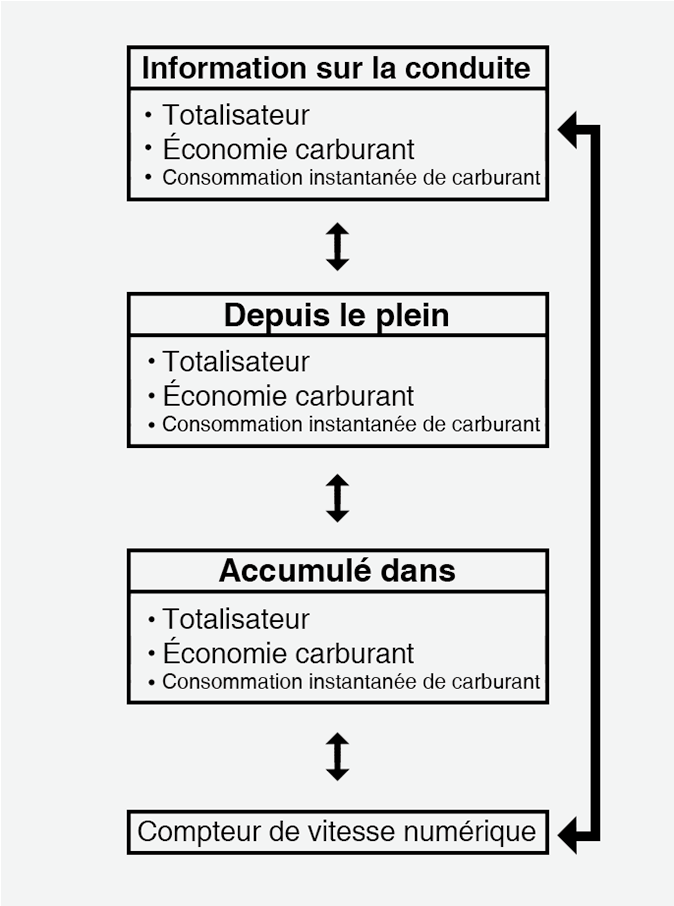 Si vous appuyez sur le bouton « OK » pendant plus d’une seconde après l’affichage de « depuis avoir fait le plein », les informations seront réinitialisées.