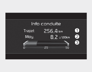 Cet affichage indique la distance parcourue (1), le rendement énergétique moyen (2) et l’économie de carburant instantanée (3).