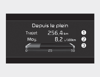 Cet affichage indique la distance parcourue (1), le rendement moyen du carburant (2) et l’économie de carburant instantanée (3) après avoir fait le plein.