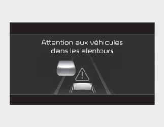 Dans la situation suivante, le message d'avertissement « Watch for surrounding vehicles » (Surveiller les véhicules environnants) apparaîtra sur le tableau de bord et un avertissement sonore retentira pour prévenir le conducteur des conditions routières ultérieures.