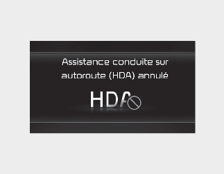 Si le conducteur n’a toujours pas les mains sur le volant après l’alerte de non-détection des mains sur le volant, le message d’alerte « Aide à la conduite sur l’autoroute (HDA) désactivée » apparaîtra et l’assistance à la conduite sur l’autoroute sera automatiquement désactivée.