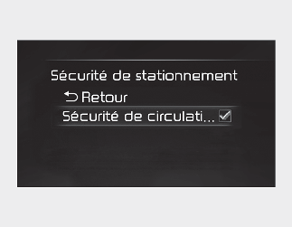 Avec le bouton ENGINE START/STOP (Marche/Arrêt du moteur) en position ON, sélectionnez « Assistance au conducteur → Sécurité de stationnement → Sécurité de circulation transversale arrière » dans le menu « Paramètres utilisateur (écran LCD) ou Paramètres → Véhicule (écran du système d'info-divertissement) » pour activer le système de sécurité de circulation transversale arrière et désélectionnez pour désactiver la fonction.