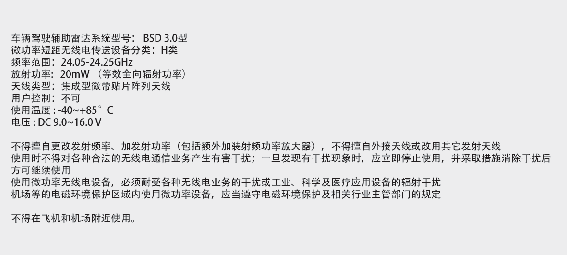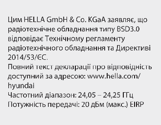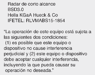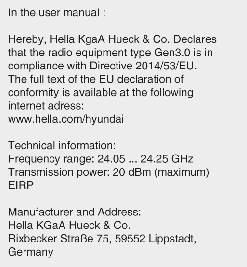 Les composants de radiofréquence (radar de coin arrière) sont conformes aux normes suivantes :
