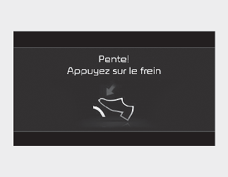 Si le véhicule est maintenu en côte en appuyant sur la pédale d'accélérateur ou en rampant avec la pédale de frein relâchée, l'embrayage et la boîte de vitesses peuvent surchauffer et provoquer des dégâts. À ce moment, un message d'avertissement s'affiche sur l'écran LCD.