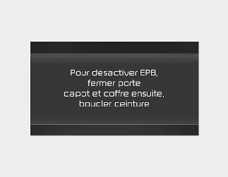 En cas de coupure accidentelle du moteur par le conducteur alors que le système de maintien automatique (selon l’équipement) fonctionne, le système EPB est automatiquement appliqué. Par contre, si le conducteur coupe le moteur et appuie sur le commutateur EPB en 1 seconde, l’EPB ne s’appliquera pas.