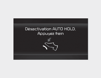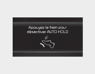 Si vous ne pressez pas sur la pédale de frein lorsque vous relâchez la fonction de maintien automatique en appuyant sur le bouton de cette fonction, un avertissement retentit et un message apparaît.