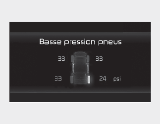 Lorsque les voyant d'avertissement du système de surveillance de la pression des pneus s'allument et que le message d'avertissement s'affiche sur l'écran LCD du tableau de bord, un ou plusieurs de vos pneus sont nettement sous-gonflés.