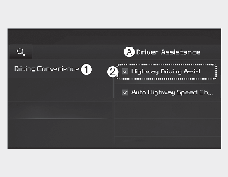 Con il veicolo acceso, selezionare Impostazioni → Assistenza conducente → Comodità di guida → Assistenza guida in autostrada sul quadro strumenti o Impostazioni → Veicolo → Assistenza di guida → Comodità di guida → Assistenza guida in autostrada sul sistema di infotainment.