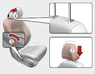 To lower the headrest, push and hold the release button (2) on the headrest support.