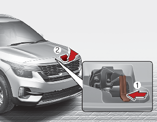 Go to the front of the vehicle, raise the bonnet slightly, push the secondary bonnet release lever (1) up side and lift the