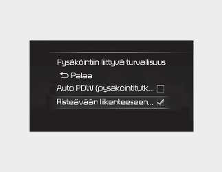Kun ENGINE START/STOP -painike on asennossa ON, voit kytkeä poikittaisen liikenteen takatörmäyksen välttämisavustajan päälle ja pois valitsemalla asetusvalikossa ”Driver Assistance (Kuljettajan avustaja) → Parking Safety (Pysäköintiturvallisuus) → Rear Cross-Traffic Safety (Poikittaisen liikenteen takaturvallisuus)'’.