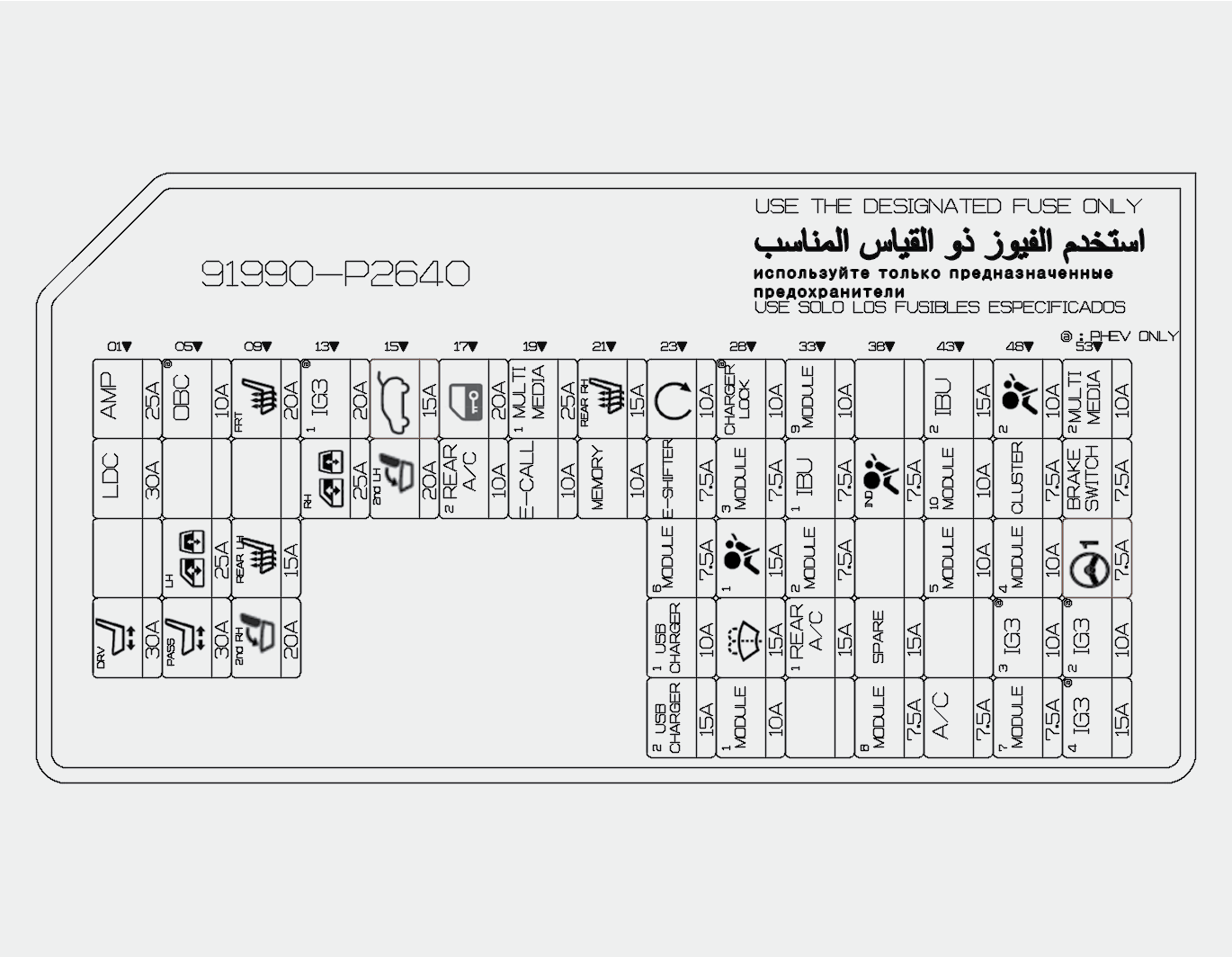 [HEV] ICU-liitäntärasia (sulake – AMP, S/HEATER (FRT), P/WINDOW (RH), 2nd ROW SEAT FOLDING(LH)) [PHEV] ICU-liitäntärasia (sulake – AMP, OBC, S/HEATER (FRT), IG3 1, P/WINDOW (RH), 2nd ROW SEAT FOLDING(LH)) |