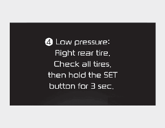 If vehicle conditions are satisfied, TPMS can indicate one position of low pressure tire. Even if TPMS indicate one position, you should check all the tires inflation pressure and adjust the tires to the recommended tire inflation pressure.