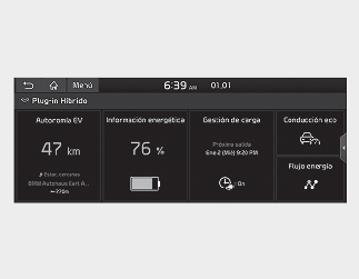 El menú del vehículo híbrido enchufable consiste en cinco secciones: [EV range] (autonomía del vehículo eléctrico), [Energy information] (información de la energía), [Charge management] (gestión de la carga), [ECO driving] (conducción ECO) y [Energy flow] (flujo energía).