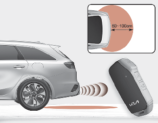 Si se sitúa en la zona de detección (50 ~ 100 cm detrás del vehículo) llevando consigo la llave inteligente, las luces de emergencia parpadearán y sonará una señal acústica durante 3 segundos para avisarle de que se detectó la llave inteligente y se abrirá el portón trasero.