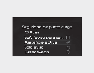 • Si se selecciona "Off" (Desactivado), la asistencia de prevención de colisión en el punto ciego se desactivará.