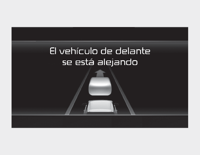 Cuando el vehículo detectado por delante inicia la marcha desde parado, la función de aviso de movimiento del vehículo de delante informa al conductor mostrando el mensaje "Leading vehicle is driving away" (El vehículo precedente se aleja) en el tablero y emitiendo un sonido de advertencia.