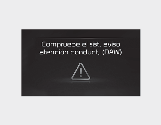 Cuando el aviso de atención al conductor no funciona correctamente, aparece el mensaje de advertencia "Check Driver Attention Warning (DAW) system" (Verificar sist. de alarma atención del conductor) en el tablero (se apaga después de cierto tiempo) y se enciende el testigo de advertencia . Si esto ocurre, recomendamos que haga inspeccionar la función en un centro de servicio/distribuidor Kia autorizado.
