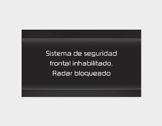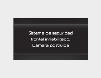 Si el parabrisas delantero donde está ubicada la cámara de visión frontal, la cubierta del radar delantero o el sensor están cubiertos por sustancias extrañas, como nieve o lluvia, puede reducirse el rendimiento de detección y limitarse de forma temporal o desactivarse la asistencia de prevención de colisión frontal. Si esto ocurre, el mensaje de advertencia "Forward Safety system disabled. Radar blocked" (Sistema de seguridad frontal deshabilitado. Radar bloqueado) aparecerá (desaparece después de un cierto tiempo) y los testigos de advertencia y se encenderán en el tablero.