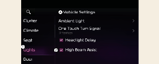 عندما تكون السيارة مضبوطة على الوضع ON (تشغيل) حدد إعدادات المستخدم ← الأضواء ← مساعد إضاءة النور العالي في مجموعة العدادات أو حدد إعداد ← المركبة ← الأضواء ← مساعد الضوء العالي في نظام المعلومات والترفيه لتشغيل وظيفة مساعد الضوء العالي.