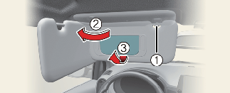 لاستخدام مرآة الزينة، اسحب حاجب الشمس لأسفل وحرِّك غطاء المرآة (3).