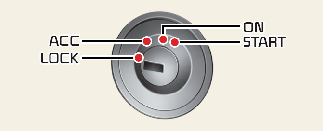 لا تقم بتدوير مفتاح الإشعال إلى الوضع LOCK (القفل) أو ACC أثناء تحرك السيارة. يؤدي ذلك إلى فقدان التحكم في الاتجاهات ووظيفة الفرامل، مما قد يتسبب في وقوع حادث.