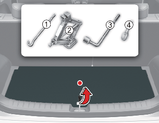 يتم تخزين الرافعة ومقبض الرافعة ومفتاح عروة العجلات وخطاف القطر في حجرة الأمتعة.
