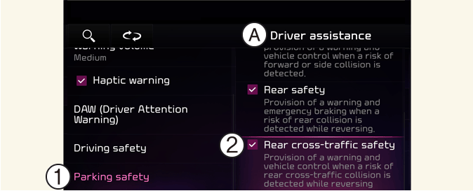 Οι ρυθμίσεις Ασφάλειας Πίσω Διασταυρούμενης Κίνησης περιλαμβάνουν «Προειδοποίηση αποφυγής σύγκρουσης πίσω από την οπίσθια διασταυρούμενη κυκλοφορίας» και «Υποβοήθηση αποφυγής σύγκρουσης πίσω κυκλοφορίας».