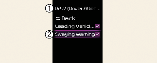 Με το όχημα σε λειτουργία, επιλέξτε Ρυθμίσεις → Υποβοήθηση οδηγού → DAW (Προειδοποίηση για την προσοχή του οδηγού) στο ταμπλό οργάνων ή Ρυθμίσεις → Όχημα → Υποβοήθηση οδήγησης → DAW (Προειδοποίηση για την προσοχή του οδηγού) στο σύστημα infotainment.