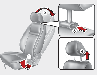 For maximum effectiveness in case of an accident, the headrest should be adjusted so the middle of the headrest is at the same height of the center of gravity of an occupant's head. Generally, the center of gravity of most people's head is similar with the height of the top of their eyes. Also, adjust the headrest as close to your head as possible. For this reason, the use of a cushion that holds the body away from the seatback is not recommended.