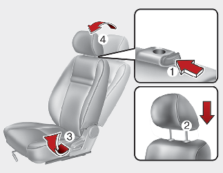 Press the headrest release button (3) while pulling the headrest up (4).