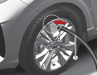손상된 타이어의 휠 공기 주입구 캡을 풀어「실런트 주입 호스」(3)를 휠 공기 주입구에 연결하여 고정하십시오.