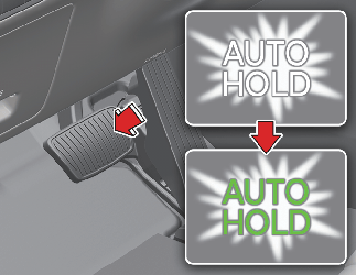 في حالة الضغط على دواسة الوقود مع وجود ذراع نقل الحركة في الوضع D (القيادة) أو الوضع اليدوي، فإن زر Auto Hold سيُحرر تلقائيًا وستبدأ السيارة في التحرك. يتغير المؤشر من الأخضر إلى الأبيض مشيرًا إلى وجود التوقف التلقائي في وضع الاستعداد وتحرير فرامل الانتظار الإلكترونية.