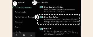 عندما تكون السيارة قيد التشغيل، حدد الإعداد ← السيارة ← مساعدة السائق ← أمان السيارة في المنطقة المحجوبة في نظام الترفيه والمعلومات.