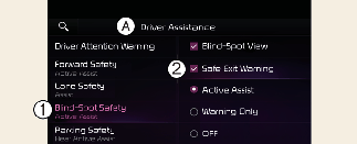 A jármű bekapcsolt állásában válassza a Driver assistance → Blind-spot safety→ Safe Exit Warning (Vezetéssegítő rendszer →Holttér-biztonság → Biztonságos kiszállás figyelmeztetés) elemet a Settings (Beállítások) menüben a Biztonságos kiszállás figyelmeztetés bekapcsolásához, vagy törölje a kijelölést a funkció kikapcsolásához.