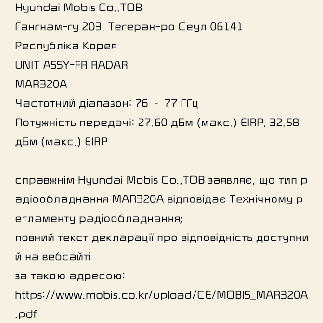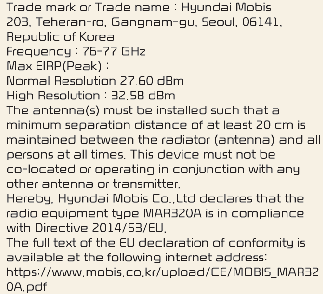 A rádiófrekvenciás alkatrészek (elülső radar) megfelelnek az alábbiaknak: