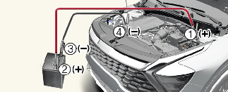 Ha elindul a motor, válassza le az indító akkumulátor negatív pólusát (3), majd az indító akkumulátor pozitív pólusát (2) és a lemerült akkumulátor pozitív pólusát (1). Ha az akkumulátor lemerülésének oka nem határozható meg, akkor ellenőriztesse a gépkocsit egy szakműhelyben. A Kia hivatalos Kia-kereskedő/szervizpartner felkeresését javasolja.
