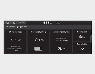 Plug-in hybrid-menuen består af fem sektioner: [EV range] (EV-rækkevidde), [Energy information] (energi-information), [Charge management] (styring af opladning), [ECO driving] (økonomisk kørsel), [Energy flow] (energi-flow).